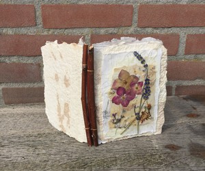 2020Handgemaakt boekje van wilgenhout en gedroogde bloemen. Met daarin bladzijden van speciaal papier.